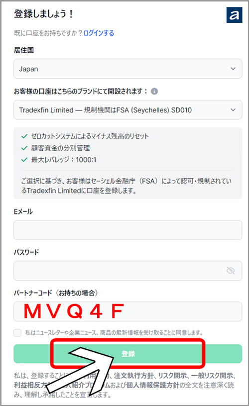 ・最初に表示される「Tradexfin Limited — 規制機関はFSA (Seychelles) SD010」のままでOK。